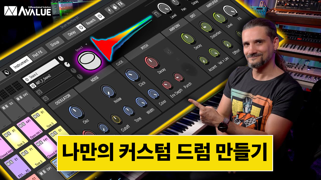 하이브리드 사운드 디자인: 드럼 신시사이저의 강력한 피치, 디케이, 노이즈, 디스토션 등의 파라미터를 조작하여, 일반적인 샘플로는 구현하기 어려운 독창적인 드럼 톤을 디자인하는 기술을 소개합니다.